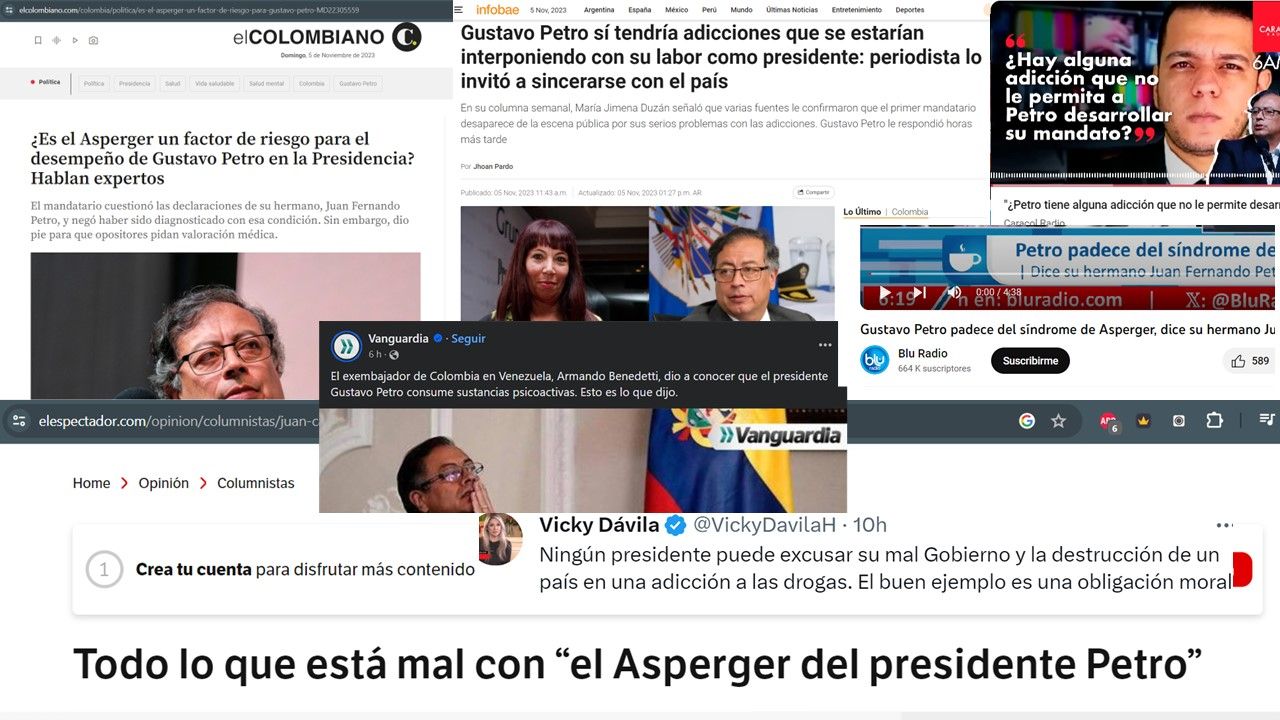 Pero como una operación mediática no puede ser tan básica por un principio sencillo de credibilidad, recientemente le dieron tres giros de telenovela: Petro es alcohólico, Petro es drogadicto, Petro no cuenta con las capacidades mentales, y por eso llega siempre tarde. Esta ha sido la operación protagónica, pero por supuesto no la única: 1. tiene problemas de carácter por eso no dialoga con nadie, 2. dialoga con todos por lo cual es sospechoso, 3. No comunica sus avances, 4. abusa de twitter para comunicarse, 5. no gobierna sólo twittea, 6. incluye en su gabinete a los partidos tradicionales, así que debe ser más de lo mismo, 7. rompe acuerdo con partidos tradicionales porque no sabe negociar, 8. seguramente va a obstruir la justicia para defender a su hijo, 9. es un mal padre por no obstruir la justicia para defender a su hijo ¿cómo confiar en él si traiciona a su propio hijo? 10. Se le ve cansado, confrontativo y ausente, debe ser que está drogado.